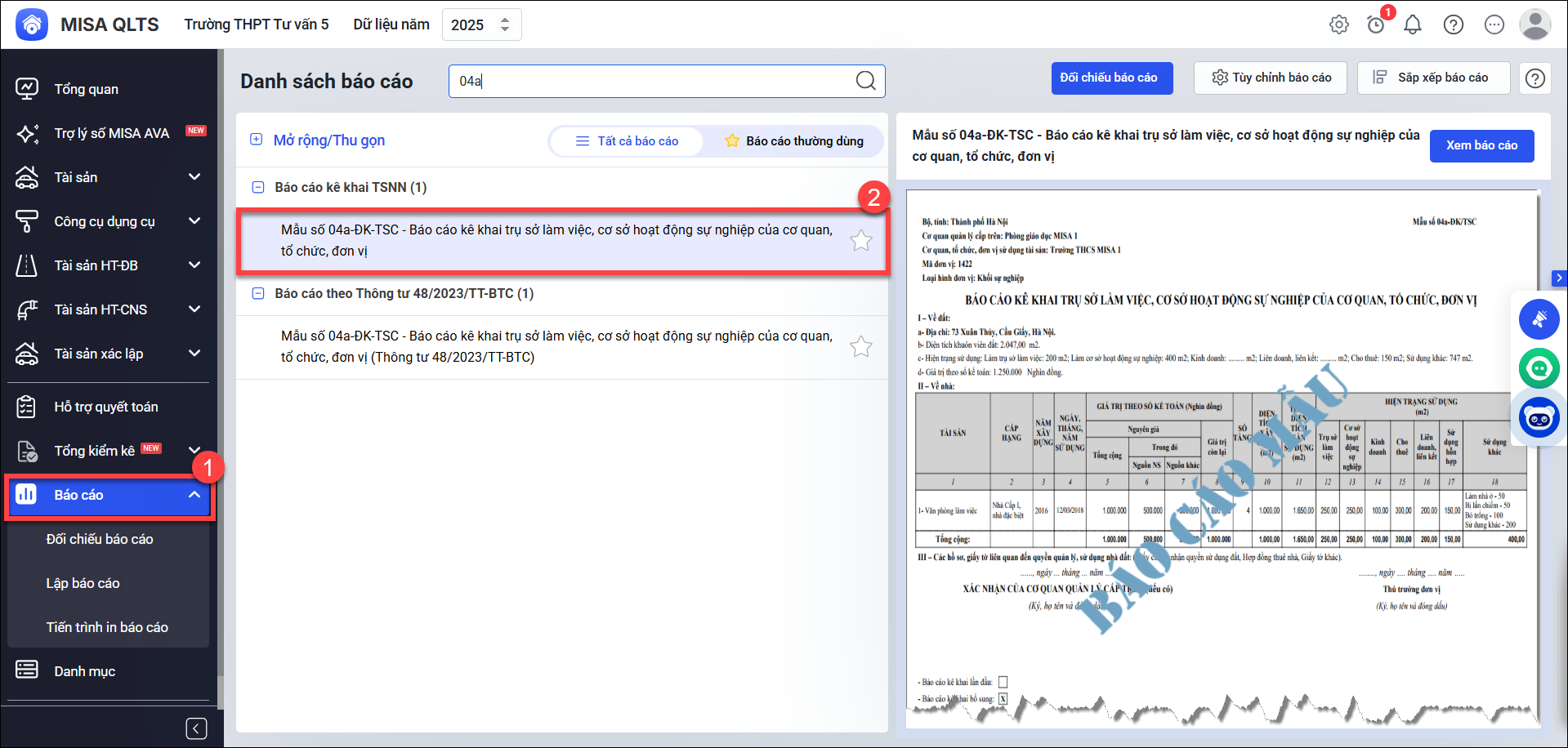 Bước 1: Vào menu Báo cáo\ Báo cáo kê khai TSNN\ chọn Mẫu số 04a-ĐK-TSC – Báo cáo kê khai trụ sở làm việc, cơ sở hoạt động sự nghiệp của cơ quan, tổ chức, đơn vị.