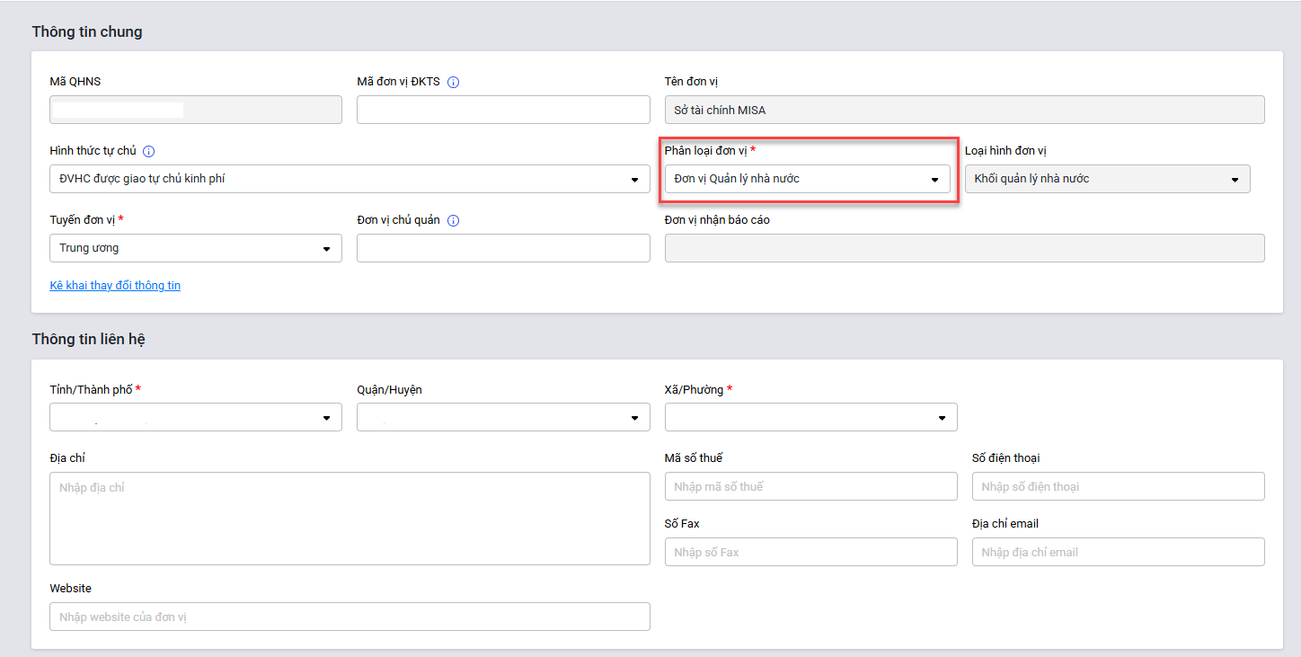 - Để Mẫu số 08a-ĐK-TSC (Phần 2) lên số liệu, cần khai báo tại Thiết lập\Thông tin đơn vị\Phân loại đơn vị.
