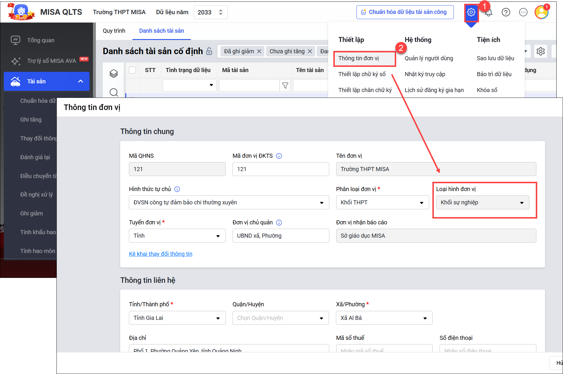 - Để Mẫu số 08b-ĐK-TSC (Phần 2) lên số liệu, cần khai báo đúng thông tin Loại hình đơn vị tại Hệ thống\Thông tin đơn vị.