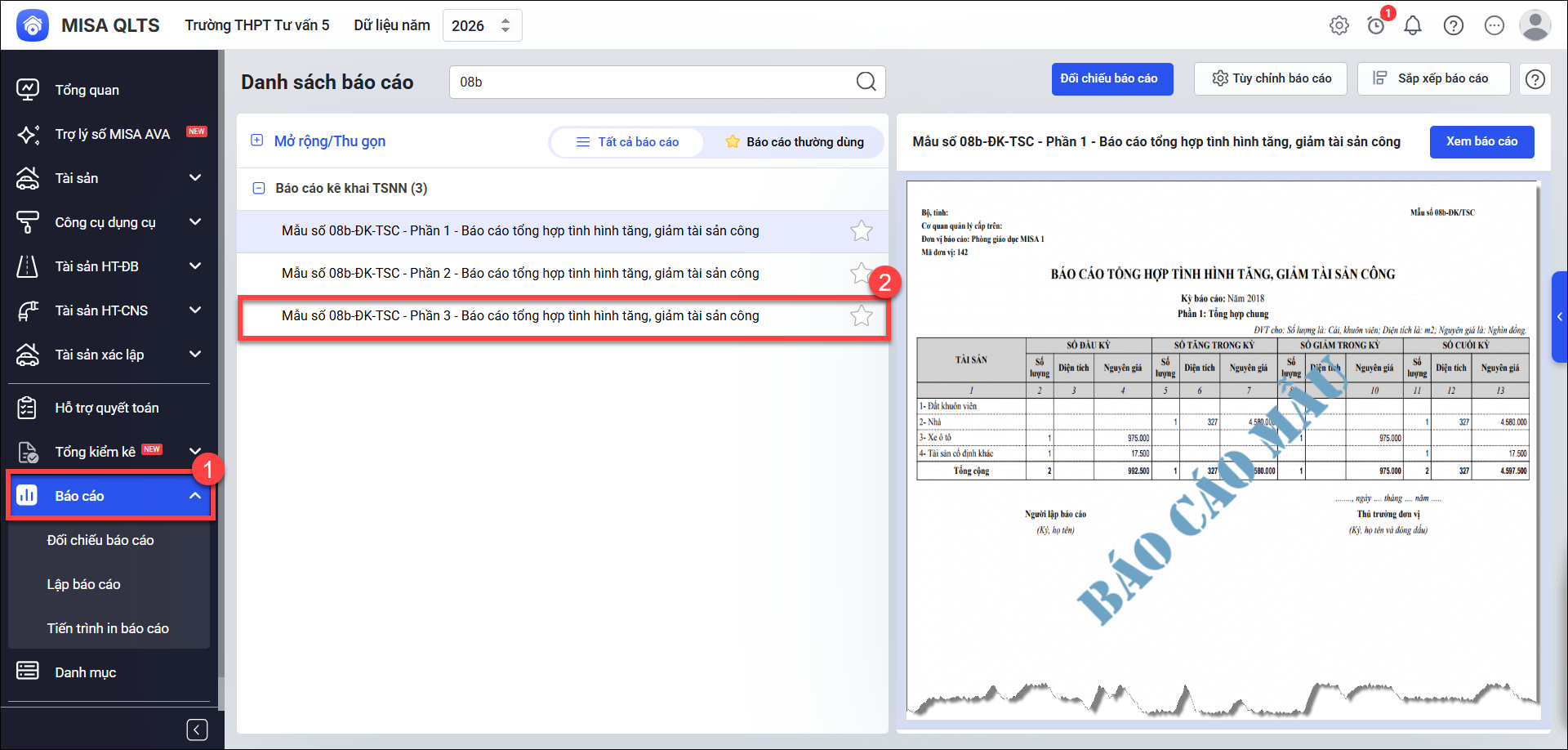 Bước 1: Vào menu Báo cáo, chọn Báo cáo kê khai TSNN\ chọn Mẫu số 08b-ĐK-TSC – Phần 3 – Báo cáo tổng hợp tình hình tăng, giảm tài sản công.