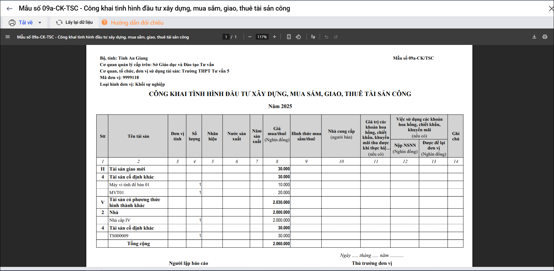 Để in báo cáo anh/chị vào menu Báo cáo\Báo cáo công khai. Nhấn vào báo cáo Mẫu số 09a-CK-TSC – Công khai tình hình đầu tư xây dựng, mua sắm, giao, thuê tài sản công.
