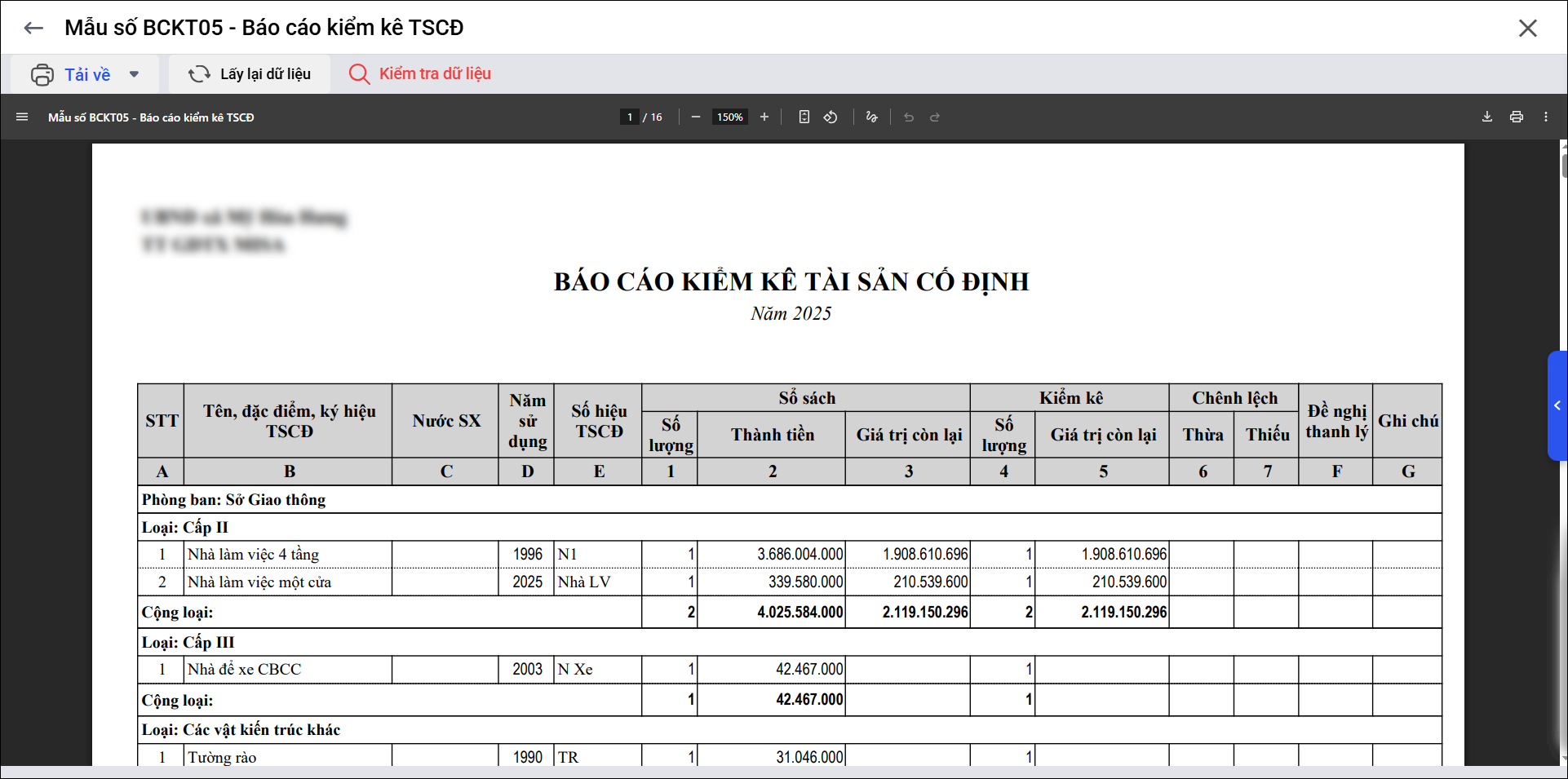 Mẫu số BCKT05 – Báo cáo kiểm kê TSCĐ là báo cáo kiểm kê tài sản cố định theo chế độ kế toán, được lập trên phần mềm MISA QLTS căn cứ vào chứng từ kiểm kê TSCĐ do đơn vị lập, nhằm đối chiếu số liệu giữa sổ kế toán và số lượng, giá trị tài sản thực tế tại đơn vị.