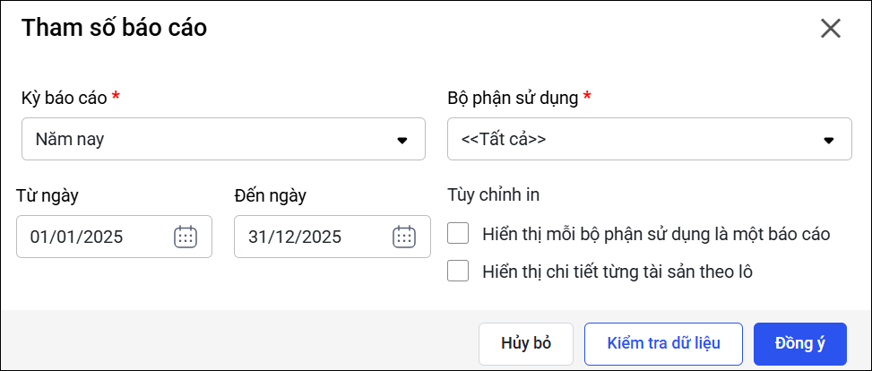 Ví dụ: Cần in Báo cáo kiểm kê TSCĐ 6 tháng cuối năm nhưng chỉ có chứng từ kiểm kê lập vào Tháng 2 sẽ không thể lấy lên số liệu báo cáo.