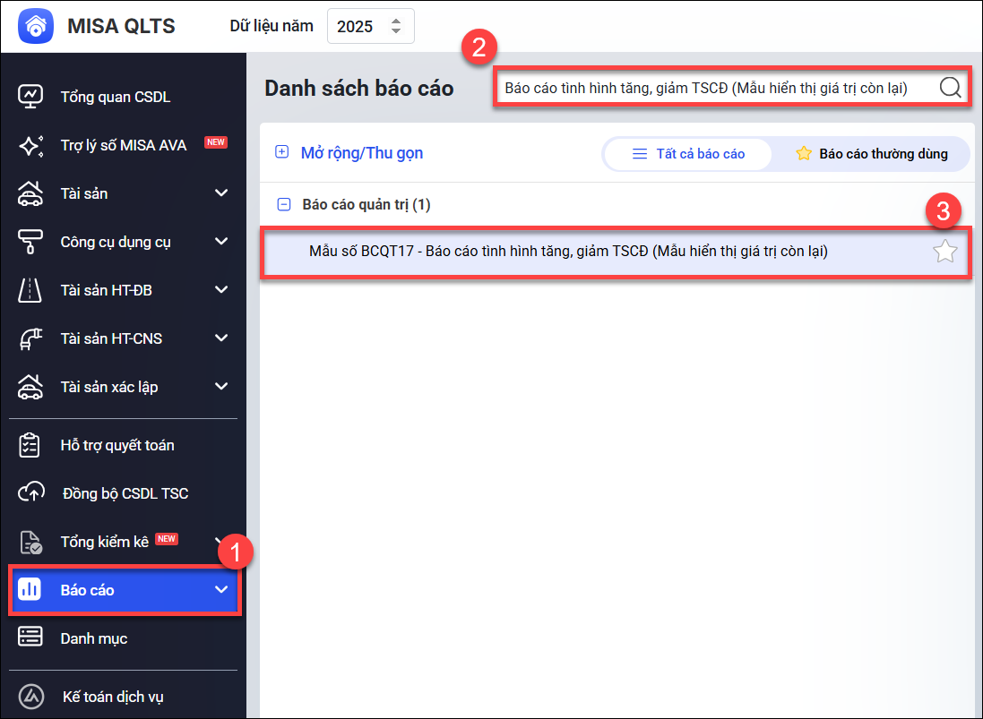Bước 1: Vào Báo cáo, gõ tên Báo cáo cần mở ở ô tìm kiếm, tích chọn Mẫu số BCQT17 – Báo cáo tình hình tăng, giảm TSCĐ (Mẫu hiển thị giá trị còn lại).