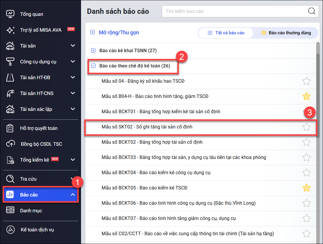 Bước 1: Vào menu Báo cáo\Báo cáo theo chế độ kế toán\chọn Mẫu số SKT02 – Sổ ghi tăng tài sản cố định.