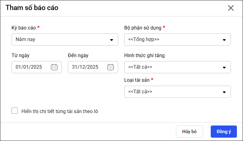 - Có thể tích chọn Hiển thị chi tiết từng tài sản theo lô.