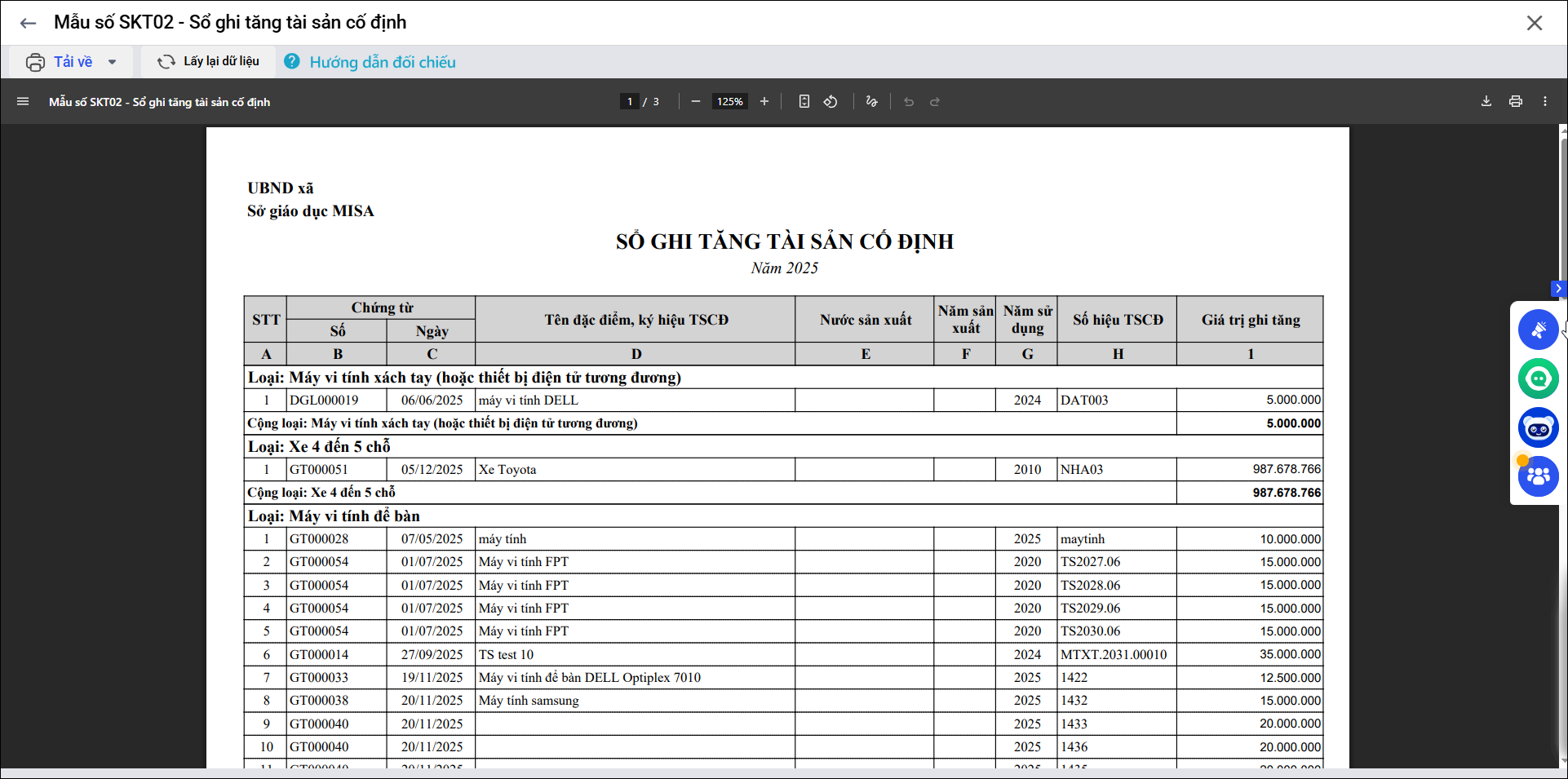 Bài viết này giúp anh/chị in được Mẫu số SKT02 – Sổ ghi tăng tài sản cố định, phục vụ mục đích quản lý danh sách tài sản được mua sắm, tiếp nhận…tại đơn vị trong năm.