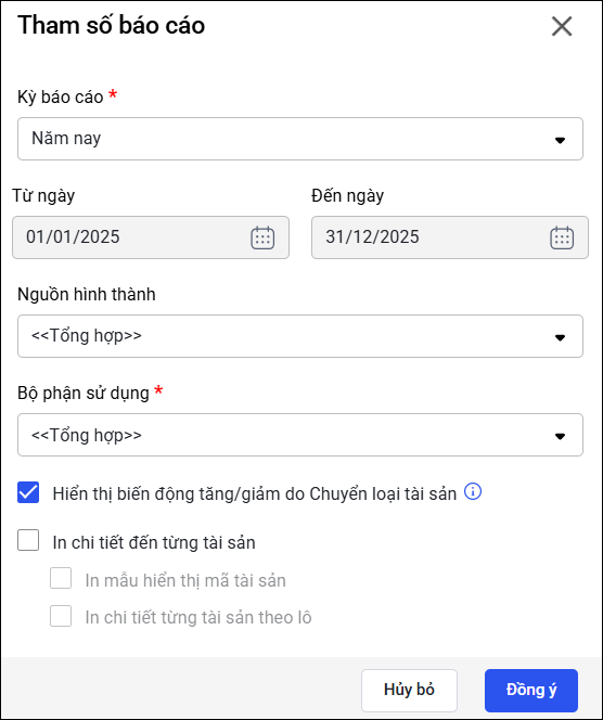 - In chi tiết loại tài sản: Tích chọn nếu muốn thể hiện chi tiết tên tài sản trên báo cáo.