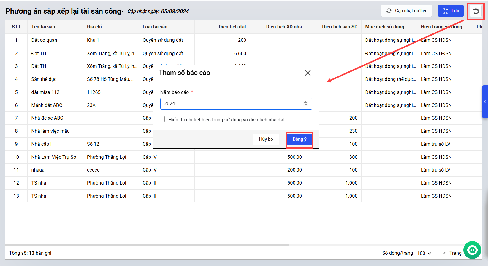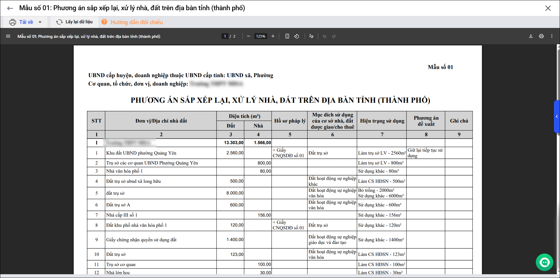 Bước 4: In Mẫu số 01: Phương án sắp xếp lại, xử lý nhà, đất trên địa bàn tỉnh (thành phố).