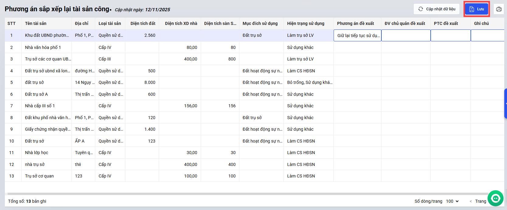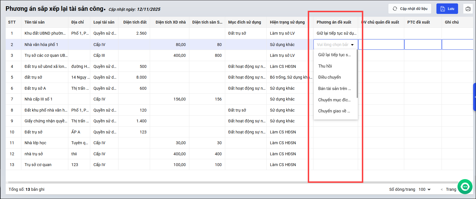 Bước 2: Phần mềm hiển thị danh sách tài sản tại đơn vị. Tại cột Phương án đề xuất, anh/chị có thể chọn các phương án đề xuất đối với tài sản tương ứng.