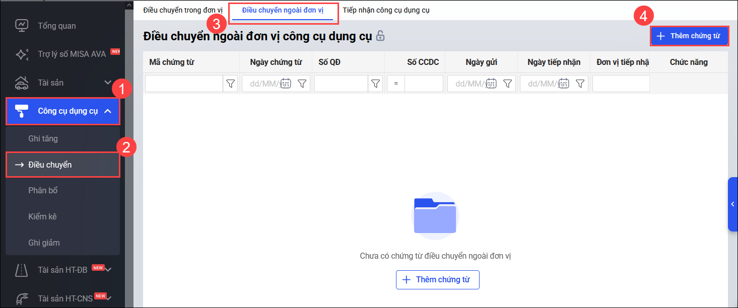 - Vào menu Công cụ dụng cụ\Điều chuyển, tại mục Điều chuyển ngoài đơn vị, chọn Thêm chứng từ.