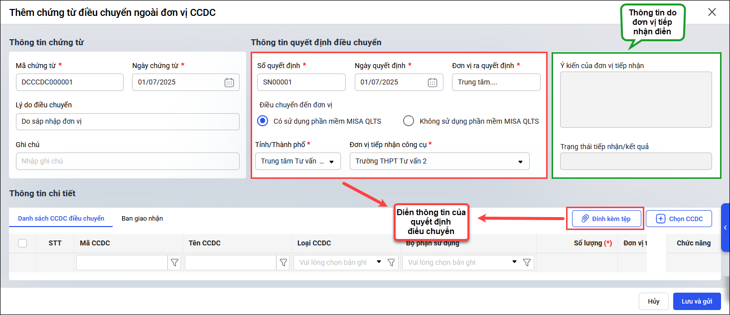 - Nhập Số quyết định; Ngày quyết định; Đơn vị ra quyết định trên quyết định điều chuyển CCDC được Trưởng đơn vị ký duyệt; trường hợp không có, có thể điền thông tin quyết định sáp nhập.