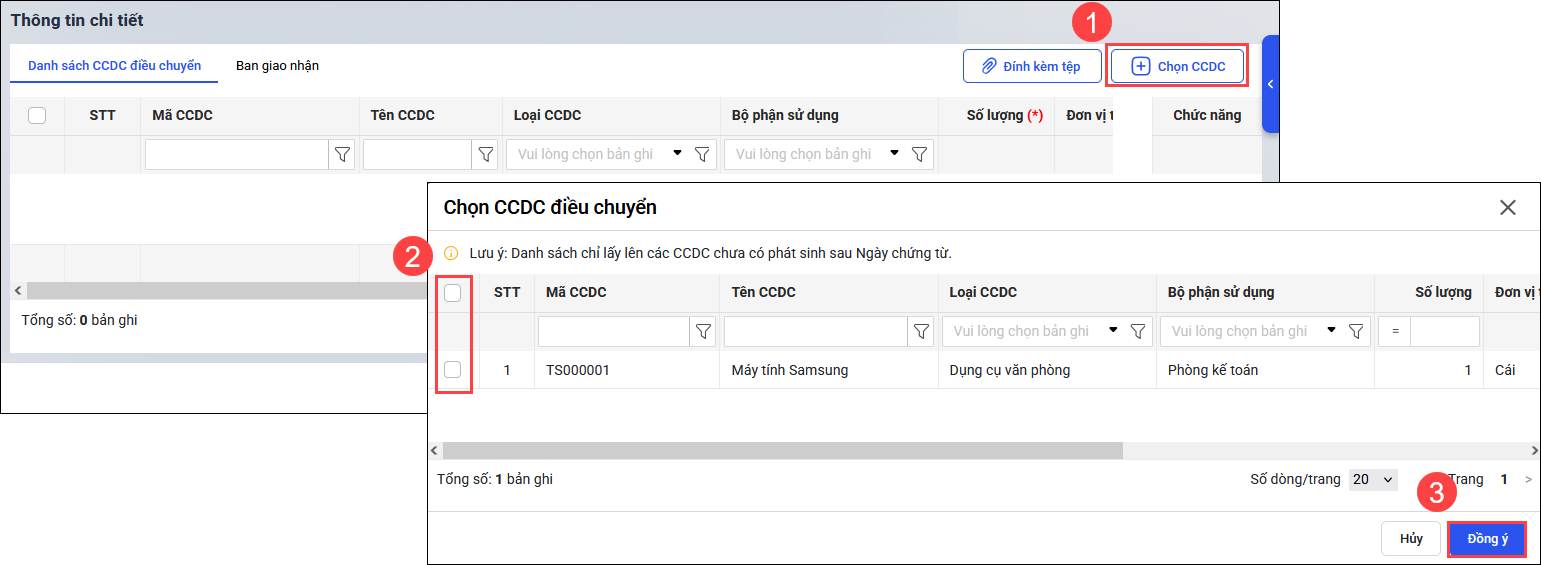Lưu ý: Danh sách CCDC chỉ lấy lên các CCDC chưa có phát sinh sau Ngày điều chuyển.