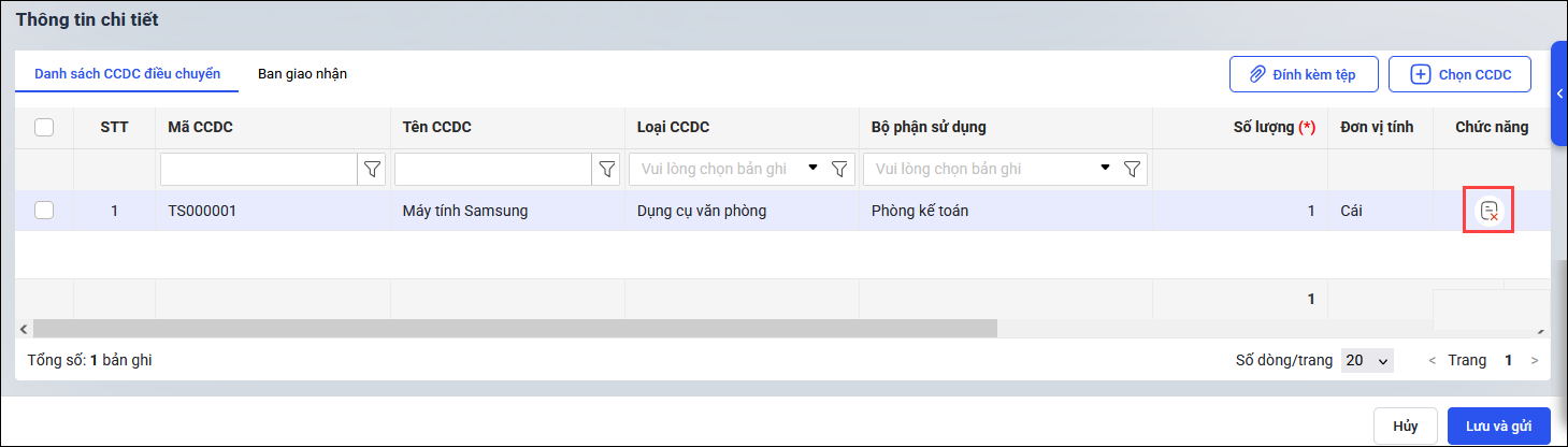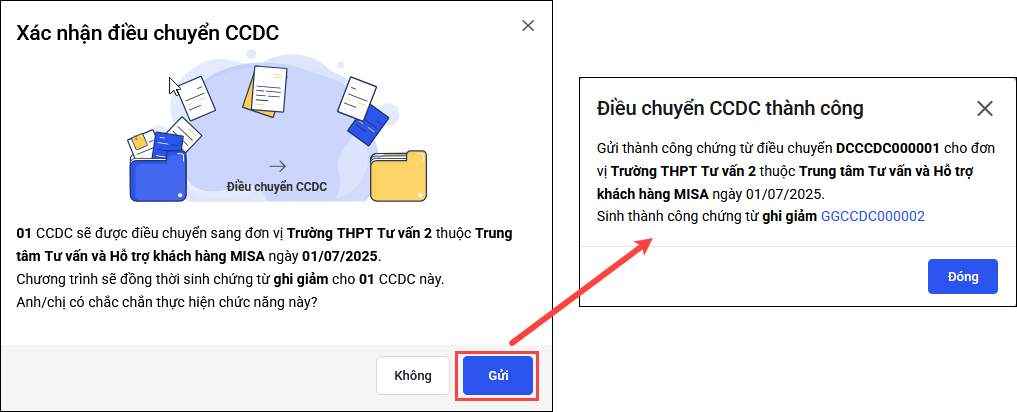 - Nhấn Lưu và gửi để lưu và gửi chứng từ điều chuyển CCDC đến đơn vị nhận bàn giao. Xác nhận Gửi.