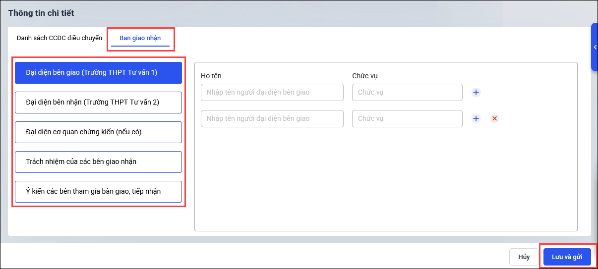 - Tại tab Ban giao nhận: Điền thông tin Đại diện bên giao, Đại diện bên nhận, Đại diện cơ quan chứng kiến (nếu có), Trách nhiệm của các bên giao nhận; Ý kiến các bên tham gia bàn giao, tiếp nhận.