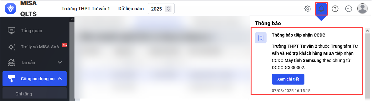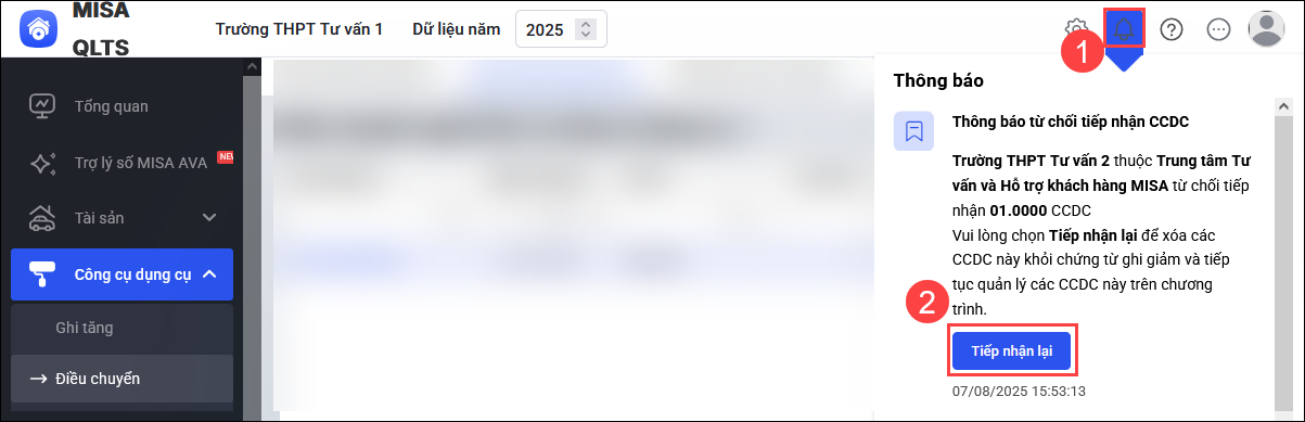 Sau khi đơn vị tiếp nhận thực hiện tiếp nhận hoặc từ chối CCDC, đơn vị điều chuyển sẽ nhận được thông báo ( ở hình quả chuông góc trên cùng tay phải).