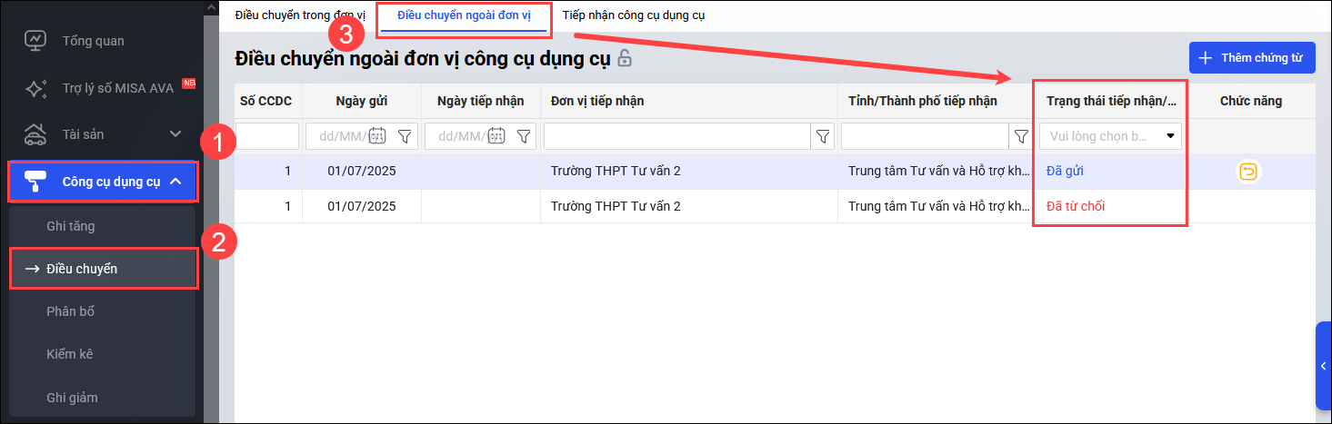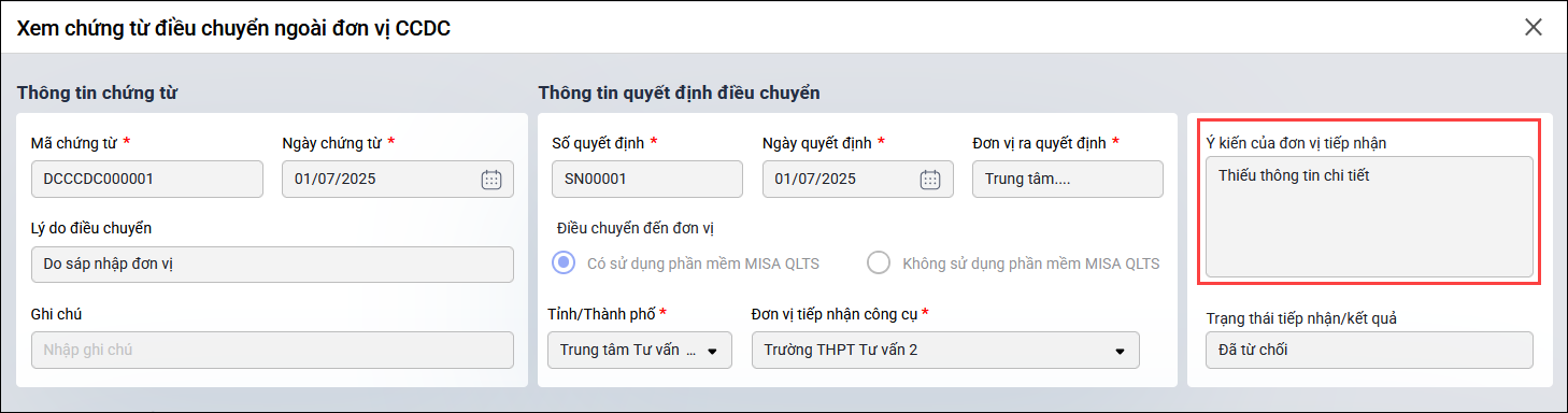 - Lưu ý: Sau khi bị từ chối điều chuyển, anh/chị mở lại chứng từ điều chuyển để xem ý kiến phản hồi của đơn vị tiếp nhận. Sau đó, thực hiện chỉnh sửa thông tin CCDC (nếu cần), sau đó thực hiện điều chuyển lại từ bước 1.