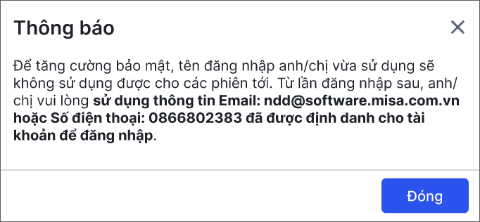 - Sau khi nhấn Đóng thông báo, hệ thống sẽ tự động cập nhật thông tin Email/SĐT vào mục Tên đăng nhập trong phần Thiết lập\Hệ thống\Quản lý người dùng.
