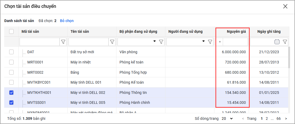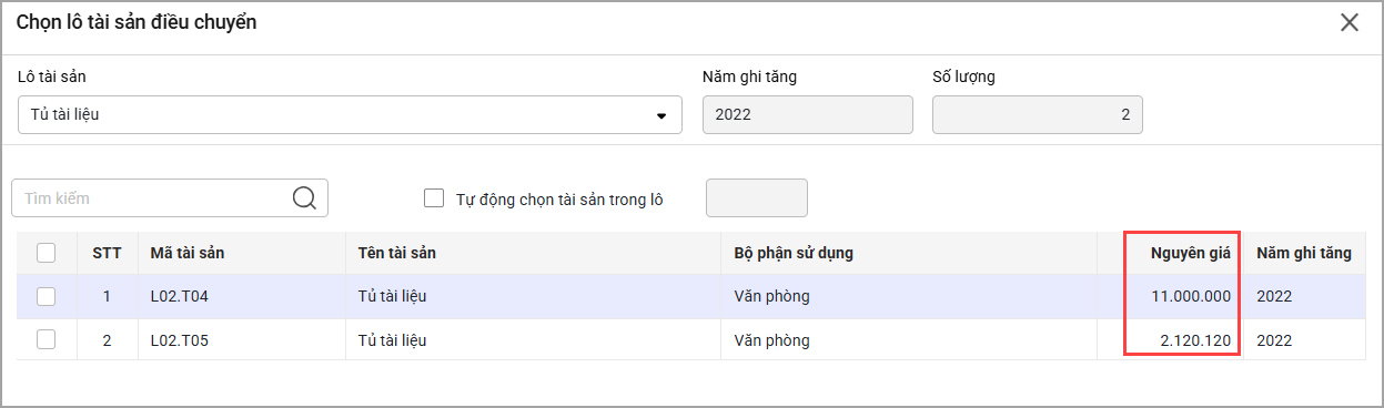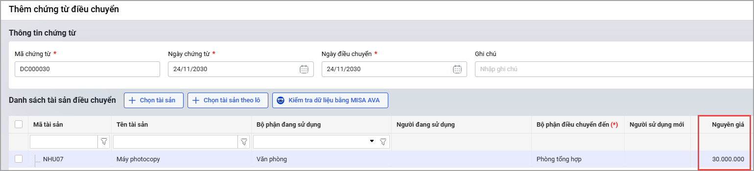 Bài viết này giúp cán bộ QLTS theo dõi được thông tin tài sản nguyên giá khi chọn tài sản cần điều chuyển theo đúng quyết định từ cấp trên