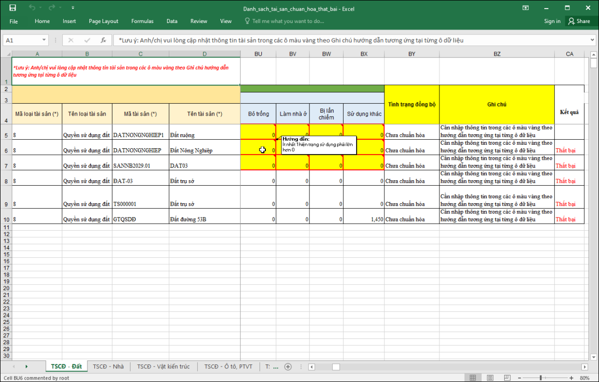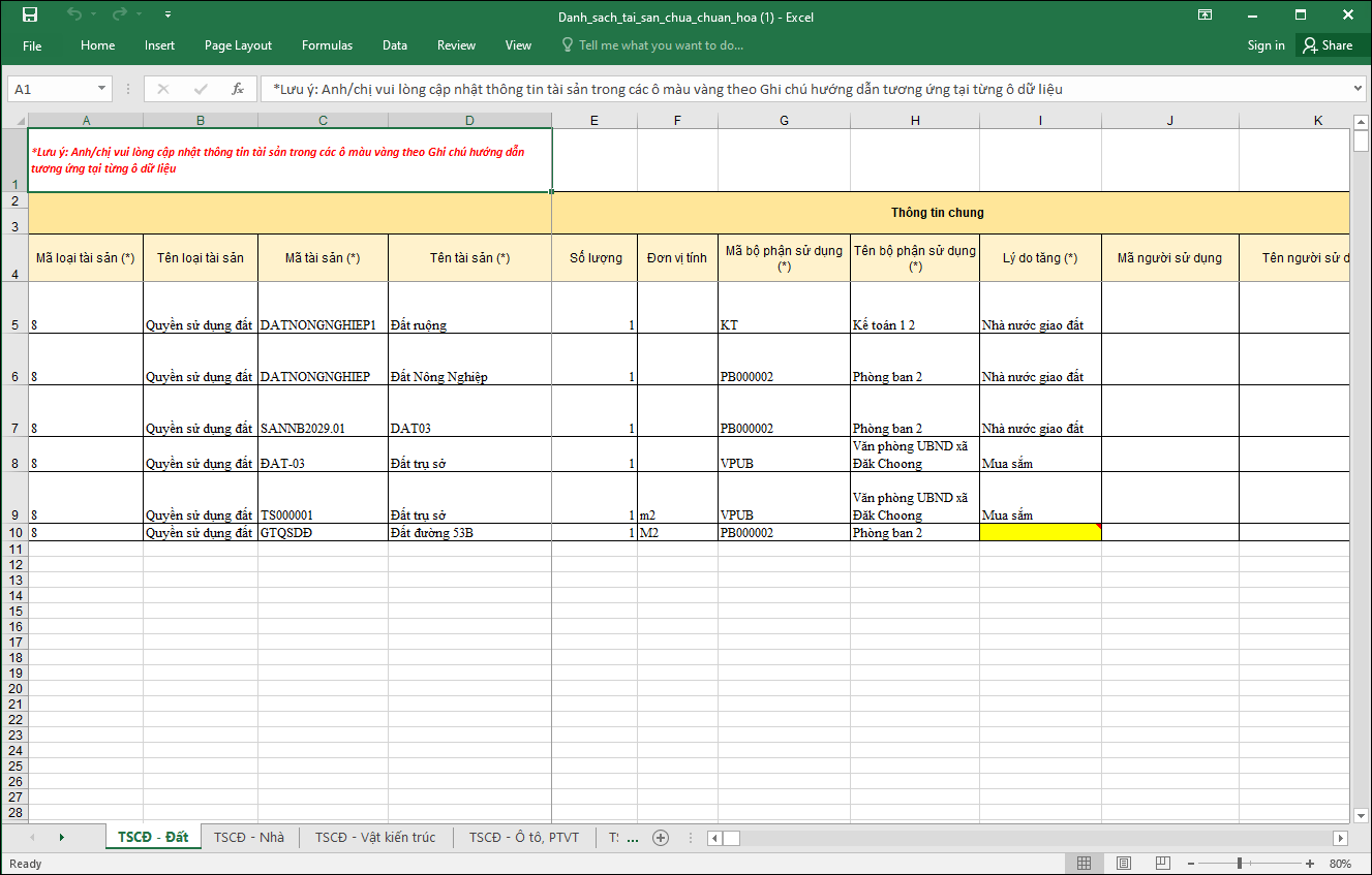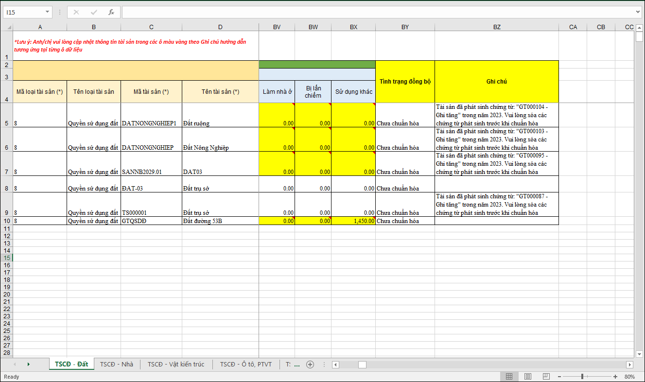 - Khi chuẩn hóa tài sản trước khi đồng bộ tài sản lên CSDLQG hàng loạt bằng file excel, trên file sẽ bôi vàng các trường thông tin cần chuẩn hóa.