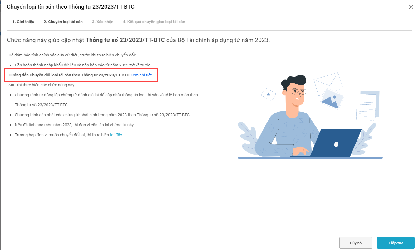 - Khi chọn Xem chi tiết điều hướng đến trang tài liệu hướng Chuyển loại tài sản theo Thông tư 23/2023/TT-BTC