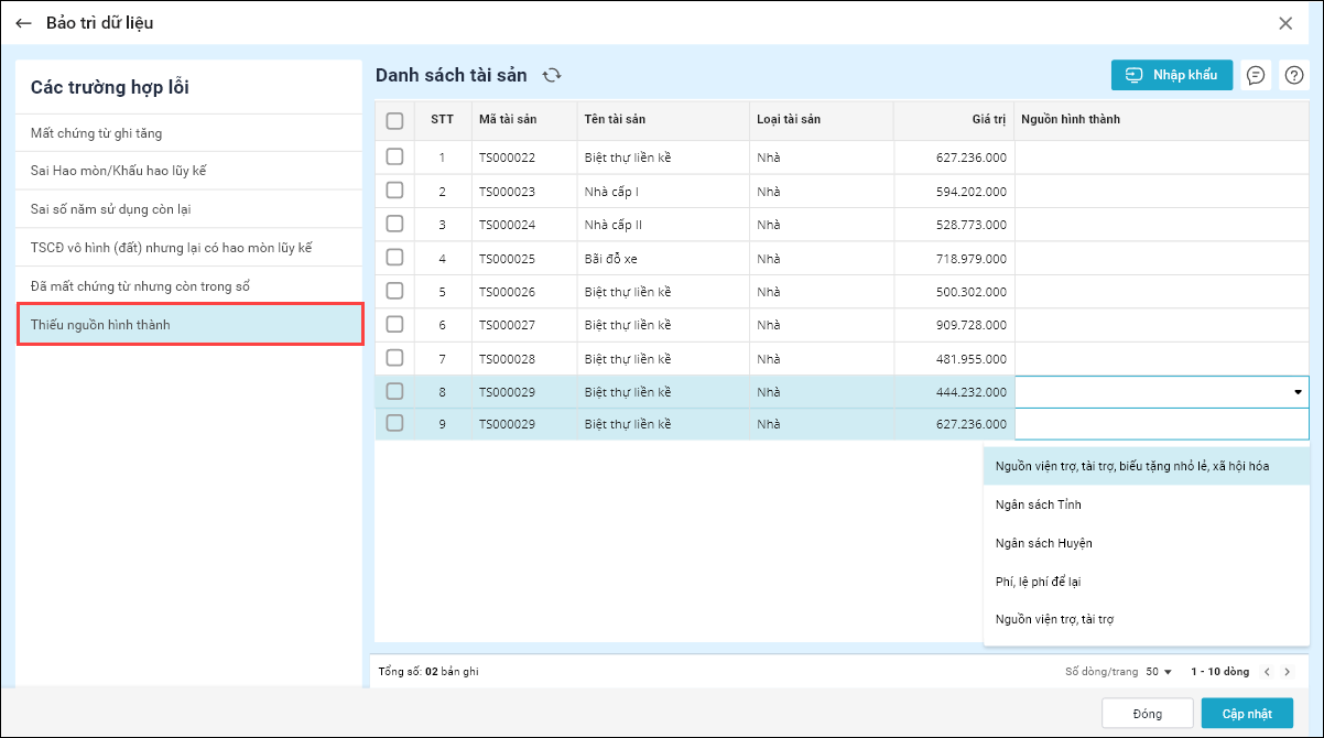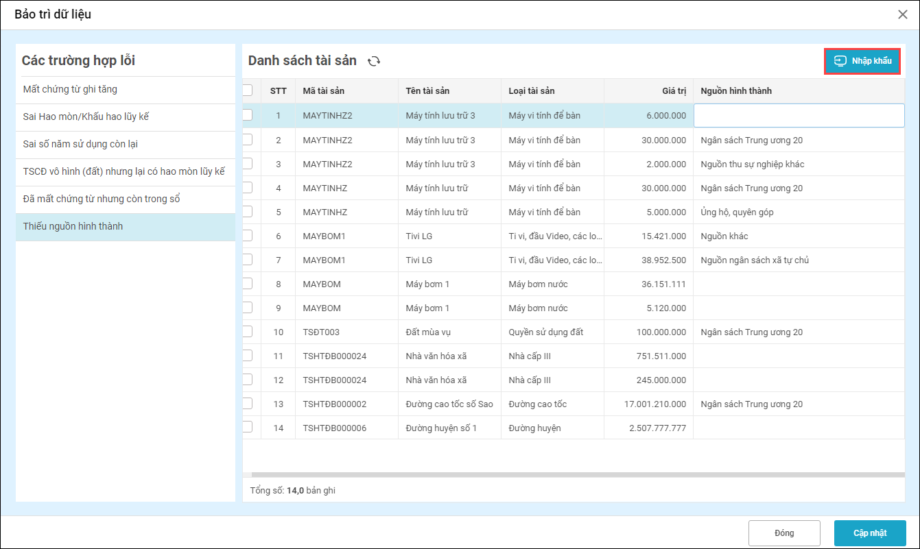 - Thêm chức năng Nhập khẩu: Cho phép tải danh sách tài sản thiếu nguồn hình thành và cập nhật lại lên phần mềm.