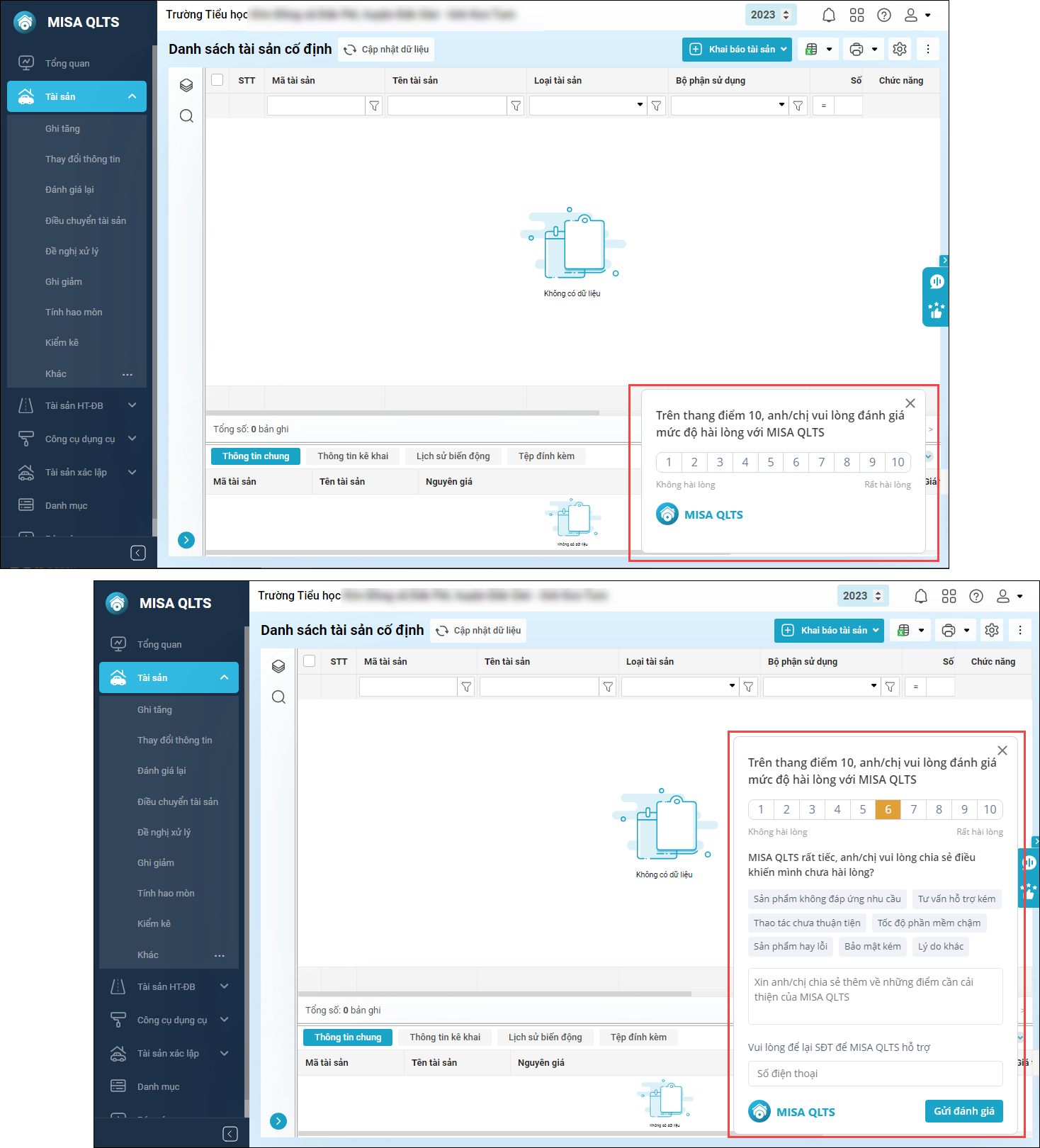 - MISA QLTS thực hiện khảo sát khách hàng trên trên phần mềm theo quy tắc NPS, kết quả khảo sát được sử dụng để đánh giá và cải tiến sản phẩm.