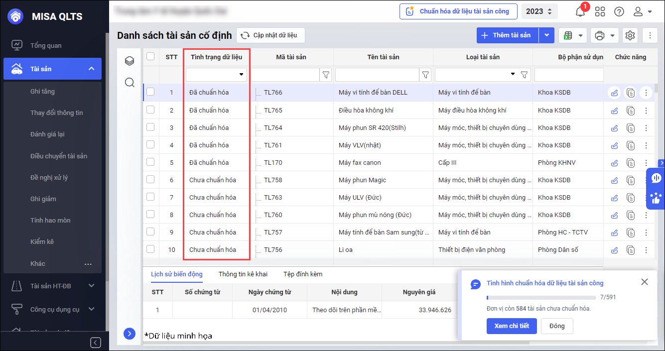 - Trên Danh sách tài sản cố định, cột Tình trạng dữ liệu thể hiện tình trạng Đã/Chưa chuẩn hóa của tài sản đangmặc định ẩn nên khách hàng không nắm được số lượng tài sản và trạng thái chuẩn hóa.