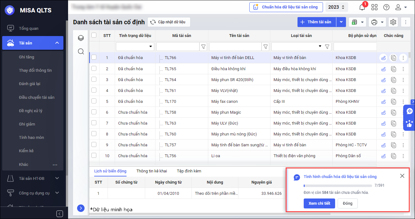 - Cán bộ QLTS cần nắm được số lượng tài sản cần chuẩn hóa để thực hiện cập nhật bổ sung theo Thông tư 48/2023/TT-BTC. Cán bộ QLTS muốn biết các điều kiện khi chuẩn hóa tài sản, cách thức cập nhật, bổ sung thông tin và kết quả sau khi thực hiện.