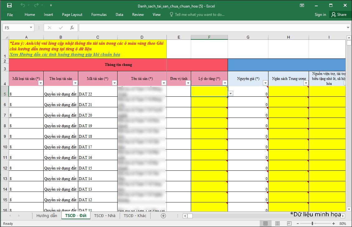 4. Cán bộ Quản lý tài sản mong muốn dễ dàng nhìn các thông tin bắt buộc cần cập nhật, bổ sung trên file excel danh sách tài sản cần chuẩn hóa để thao tác chuẩn hóa nhanh chóng hơn