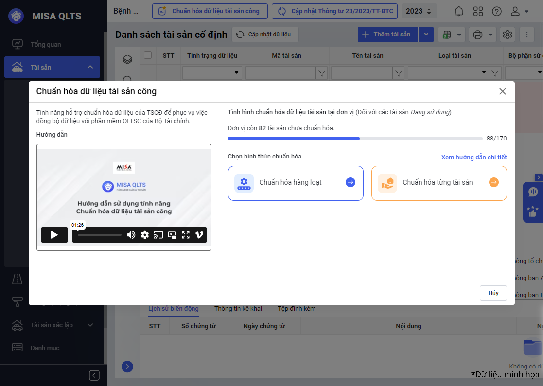 - Tại tính năng Chuẩn hóa dữ liệu tài sản công: Bổ sung video hướng dẫn cách thức chuẩn hóa tài sản.