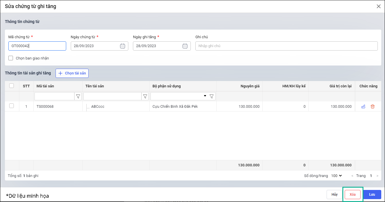 - Đối với chứng từ có 1 tài sản hoặc muốn xóa toàn bộ chứng từ: Chỉ có thể xóa chứng từ ở màn hình Danh sách chứng từ, khi ở trạng thái Xem/Sửa chứng từ không cho phép xóa.