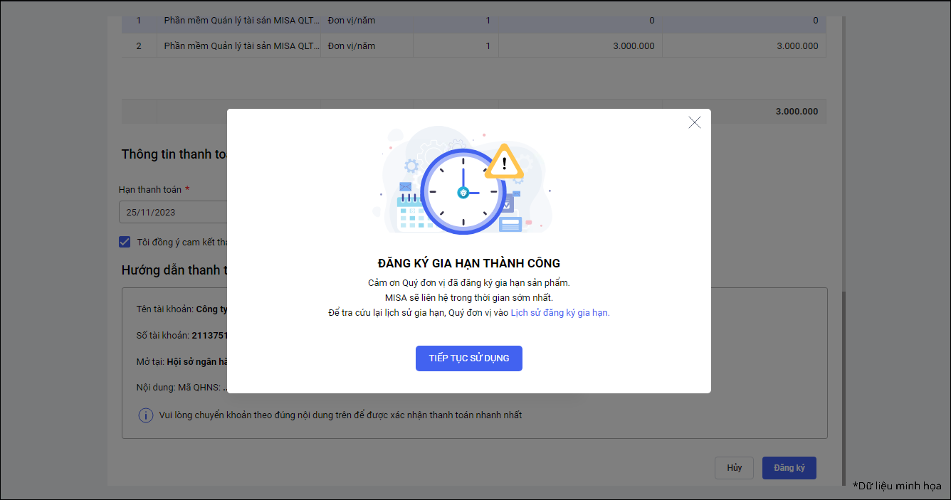 - Tại màn hình thông báo Đăng ký gia hạn thành công: Thay đổi câu hướng dẫn, cán bộ tài sản chọn Tiếp tục sử dụng để được chuyển đến truy cấp vào phần mềm, không cần đăng nhập lại.