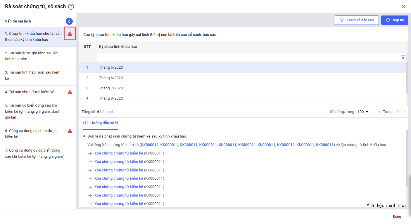 - Bổ sung tính năng Rà soát chứng từ, sổ sách: Cán bộ Quản lý tài sản nắm bắt nhanh những chứng từ chưa phù hợp với nghiệp vụ quản lý tài sản có thể làm ảnh hưởng đến số liệu báo cáo để kịp thời điều chỉnh, nhập bù các chứng từ phát sinh trong năm.