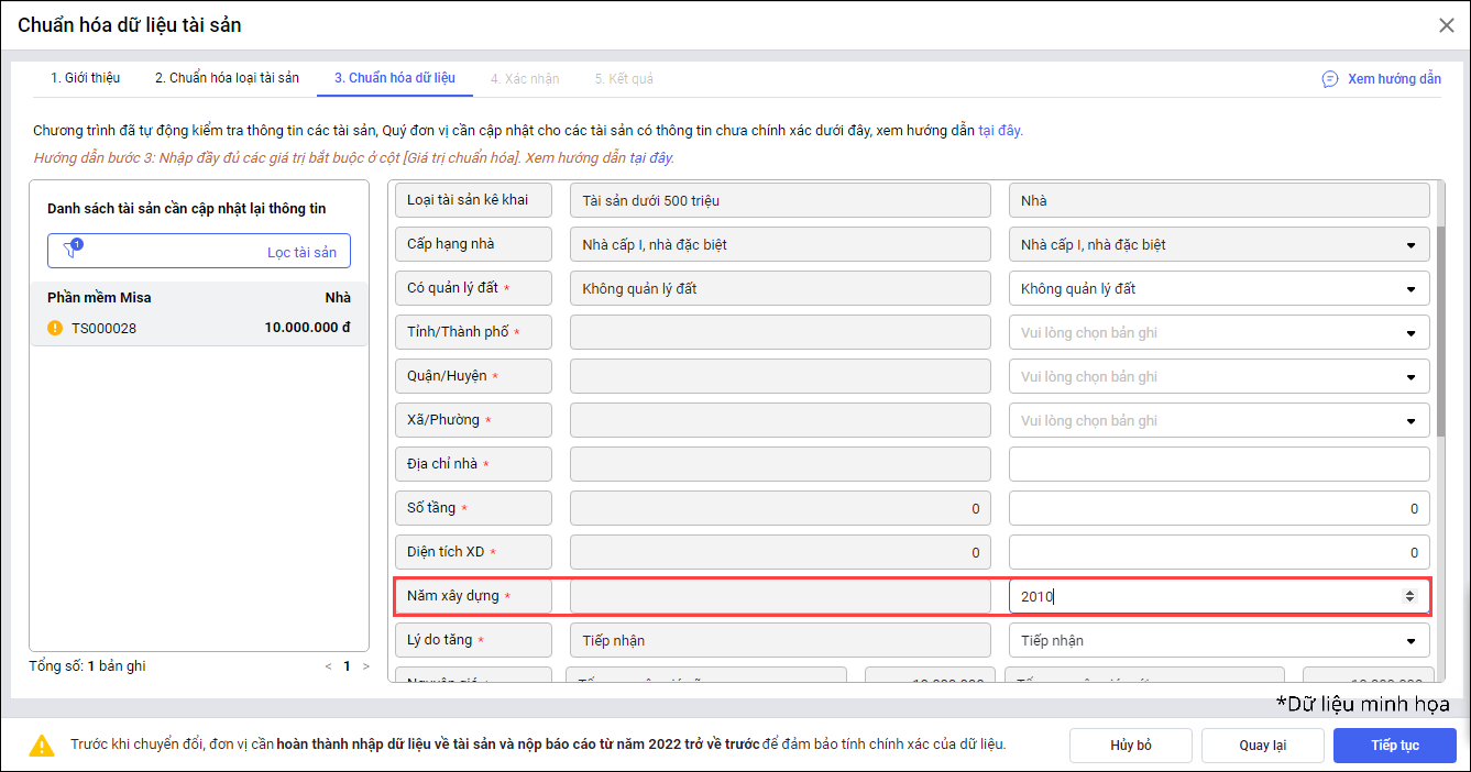 - Với các tài sản cũ, phần mềm không bắt buộc nhập Năm xây dựng. Khi thực hiện chuẩn hóa tài sản: