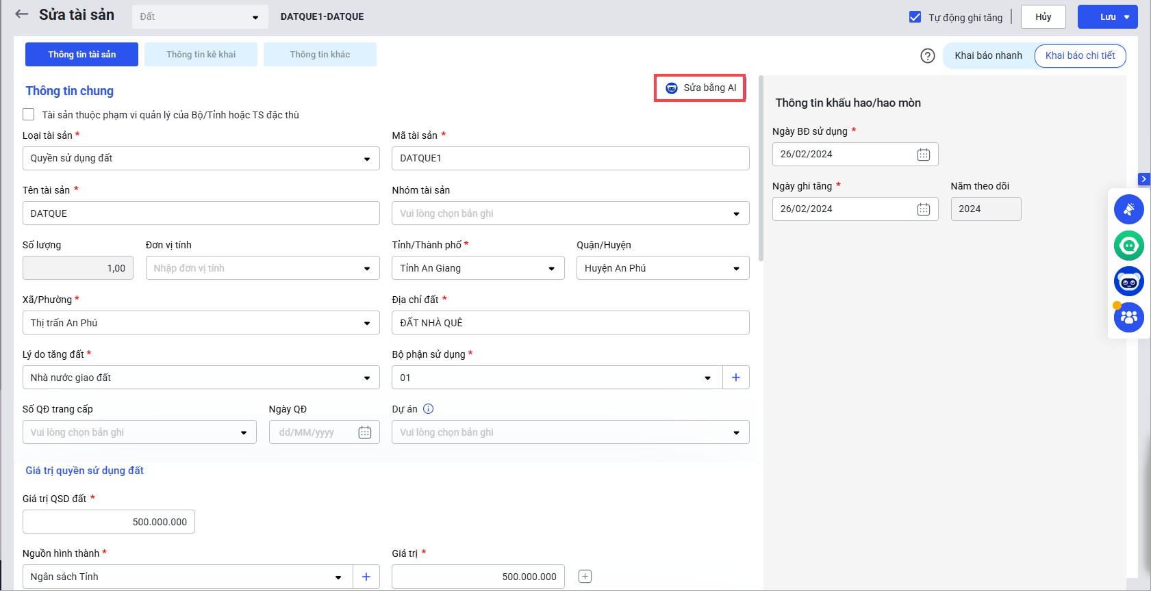2. Tại màn hình Sửa tài sản, bấm Sửa bằng AI