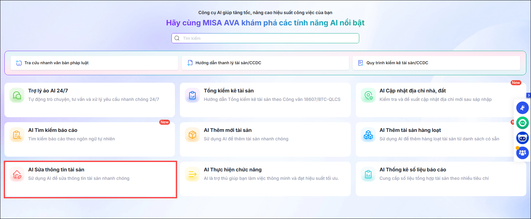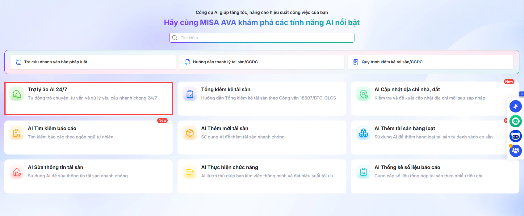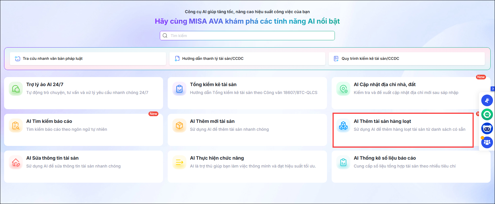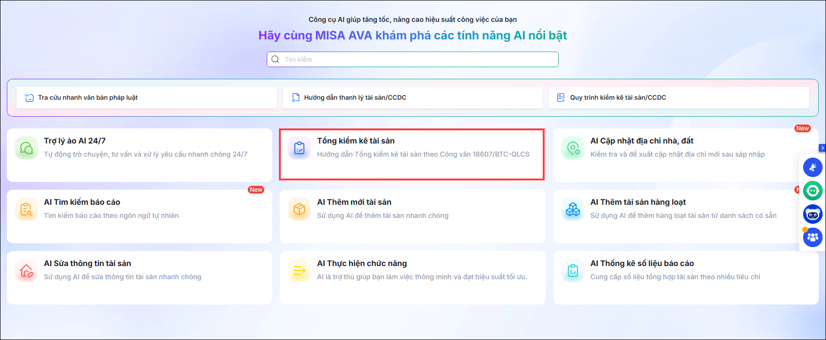 Vào Trợ lý số AI, phần mềm hiển thị tính năng AI nổi bật bao gồm: Trợ lý ảo AI 24/7; Tổng kiểm kê tài sản; AI cập nhật địa chỉ nhà đất; AI tìm kiếm báo cáo; AI Thêm mới tài sản; AI thêm tài sản hàng loạt; AI sửa thông tin tài sản; AI thực hiện chức năng; AI thống kê số liệu báo cáo…