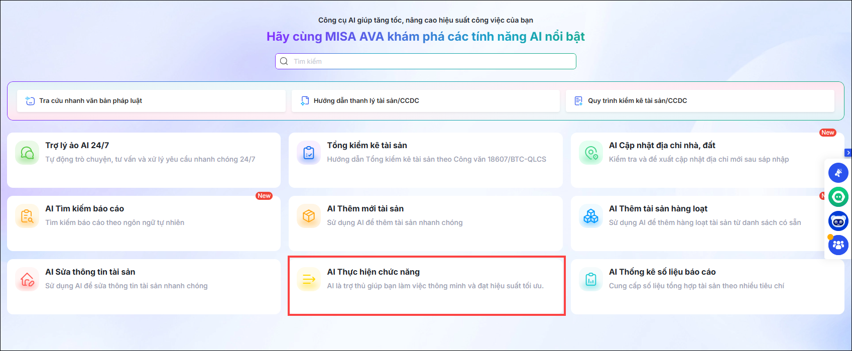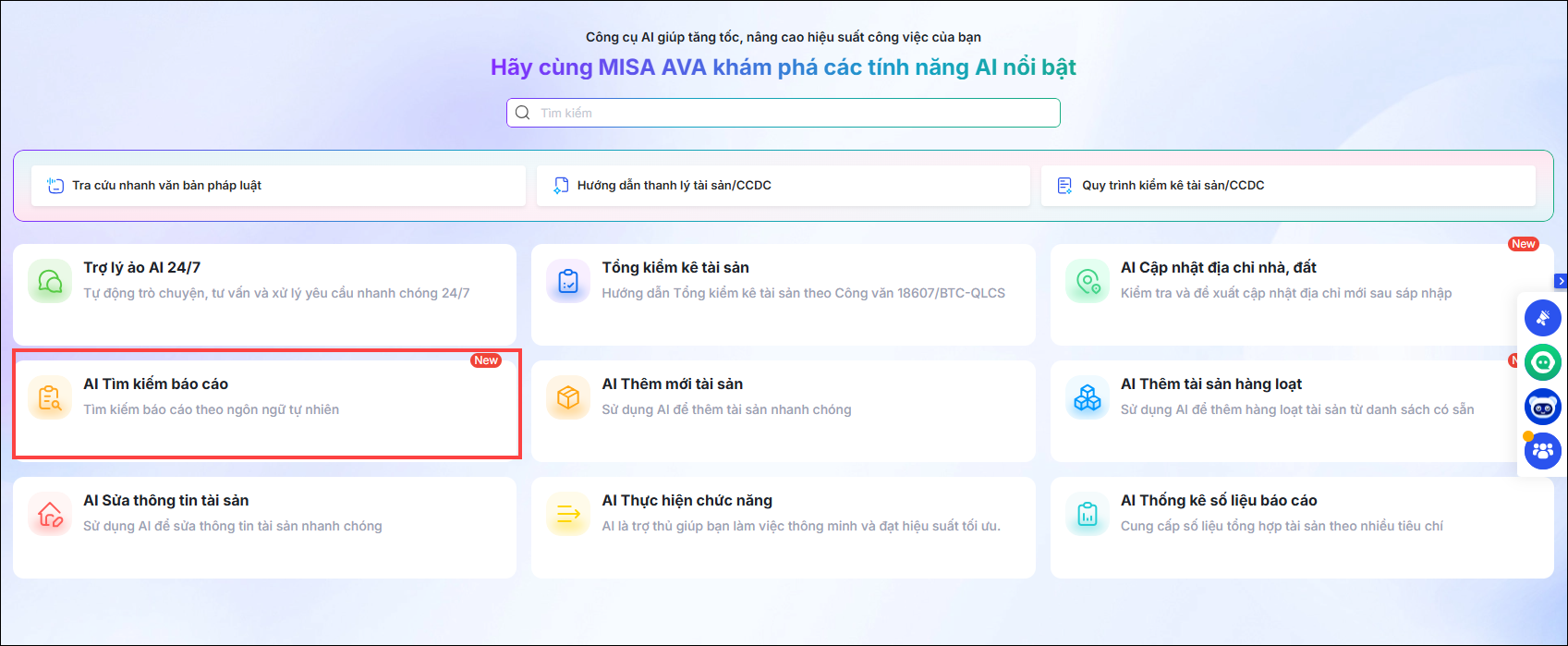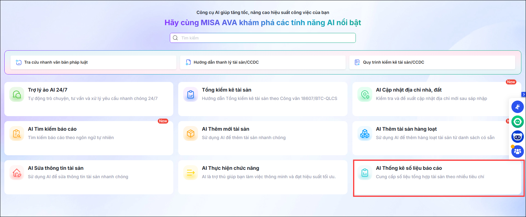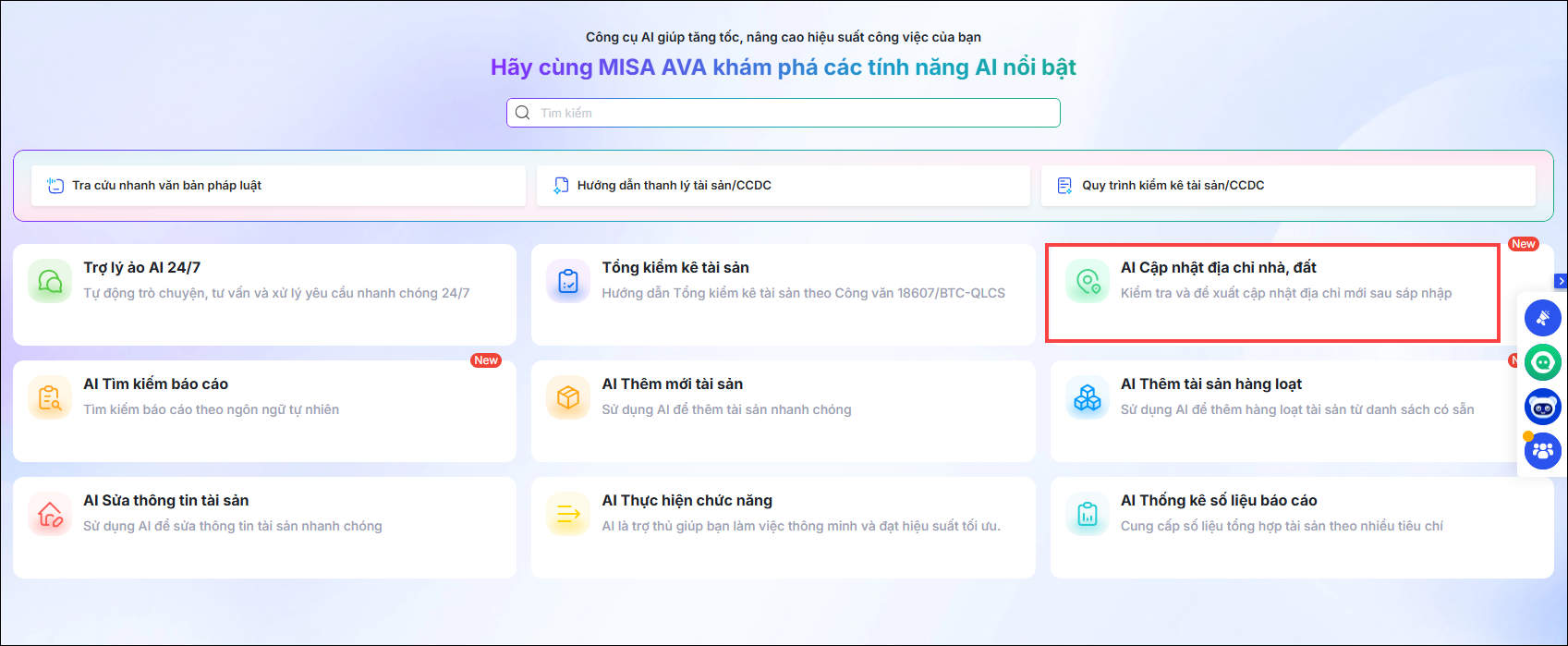 Vào Trợ lý số AI, phần mềm hiển thị tính năng AI nổi bật bao gồm: Trợ lý ảo AI 24/7; Tổng kiểm kê tài sản; AI cập nhật địa chỉ nhà đất; AI tìm kiếm báo cáo; AI Thêm mới tài sản; AI thêm tài sản hàng loạt; AI sửa thông tin tài sản; AI thực hiện chức năng; AI thống kê số liệu báo cáo…