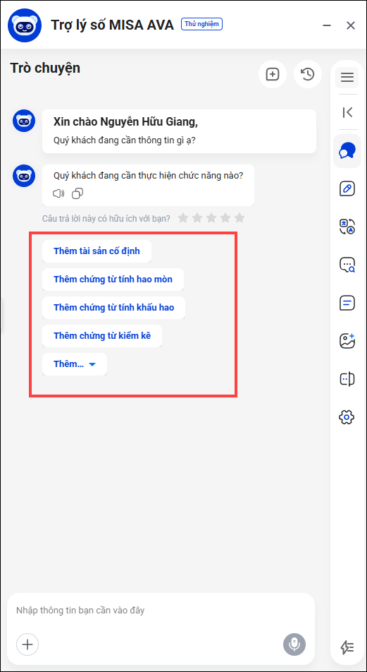- Anh/chị nhập chức năng vào khung chat để MISA AVA hỗ trợ