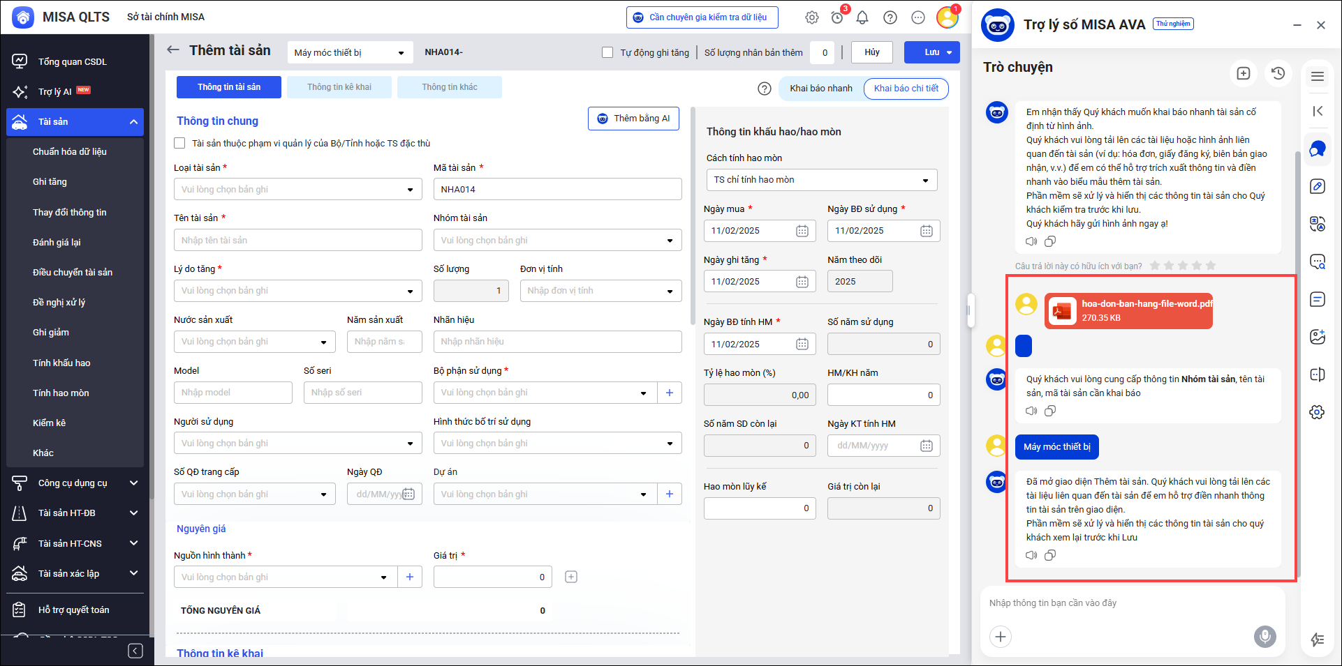 - MISA AVA gợi ý 1 số chức năng nổi bật trên phần mềm như: Thêm tài sản cố định; Thêm chứng từ tính hao mòn; Thêm chứng từ tính khấu hao; Thêm chứng từ kiểm kê… Anh/chị bấm vào từng tính năng sau đó làm theo hướng dẫn từ AVA.